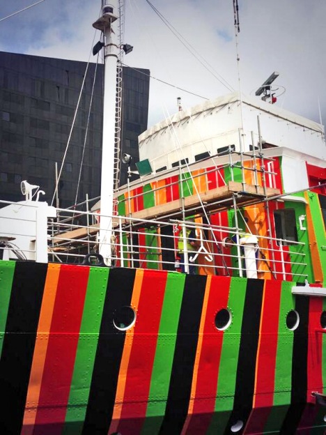 The artist has been commissioned by the Liverpool Biennial of Contemporary Art and Tate Liverpool to commemorate the centenary of the beginning of World War I by creating his contemporary version of a World War I ‘dazzle-ship’ in Liverpool’s Albert Dock, adjoining the river Mersey. A dazzle-ship’s abstract geometric-form of camouflage was devised in 1917 (and applied by the English artist Edward Wadsworth) to distort optically a ship’s shape, so that it was difficult for German submarines to calculate the course it was travelling on, and so know from what angle to attack. But so far the Venezuelan artist’s ‘take’ on a dazzle-ship has been met by Scouse wits comparing it to a tube of Refreshers, the 1970s British sweet!