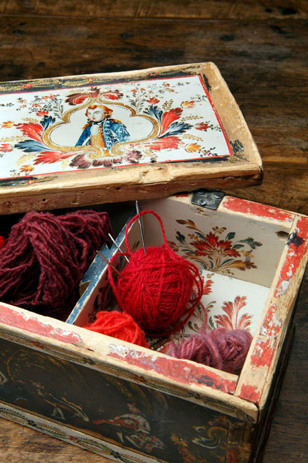 (Photo: Sewing box with cover with cochineal dyed wool yarn -detail). Box, Patzcuaro, Michoacan, Mexico, late 18th century. Wood, paint, metal, gold leaf, 4 3/4 x 17 5/16 x 5 inches. IFAF Collection, Courtesy of the Museum of International Folk Art, Photo, Addison Doty)