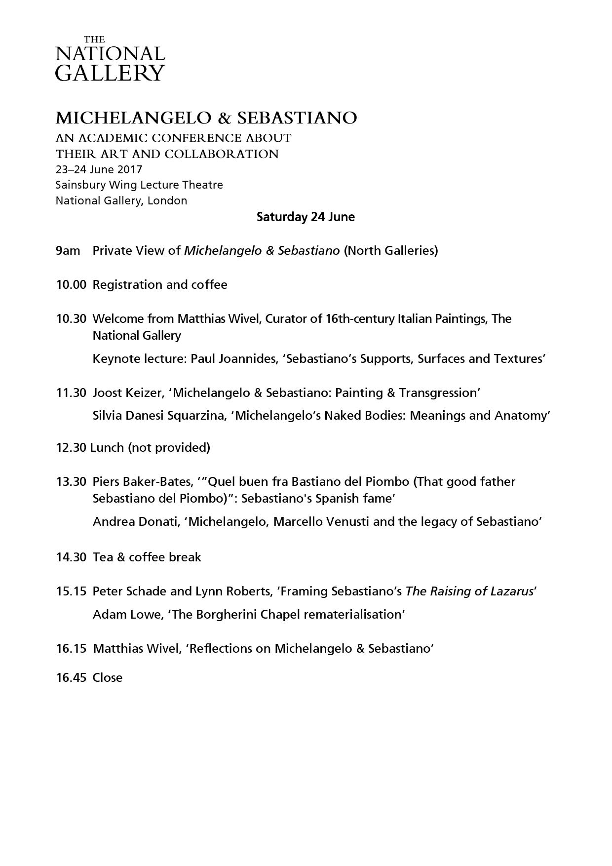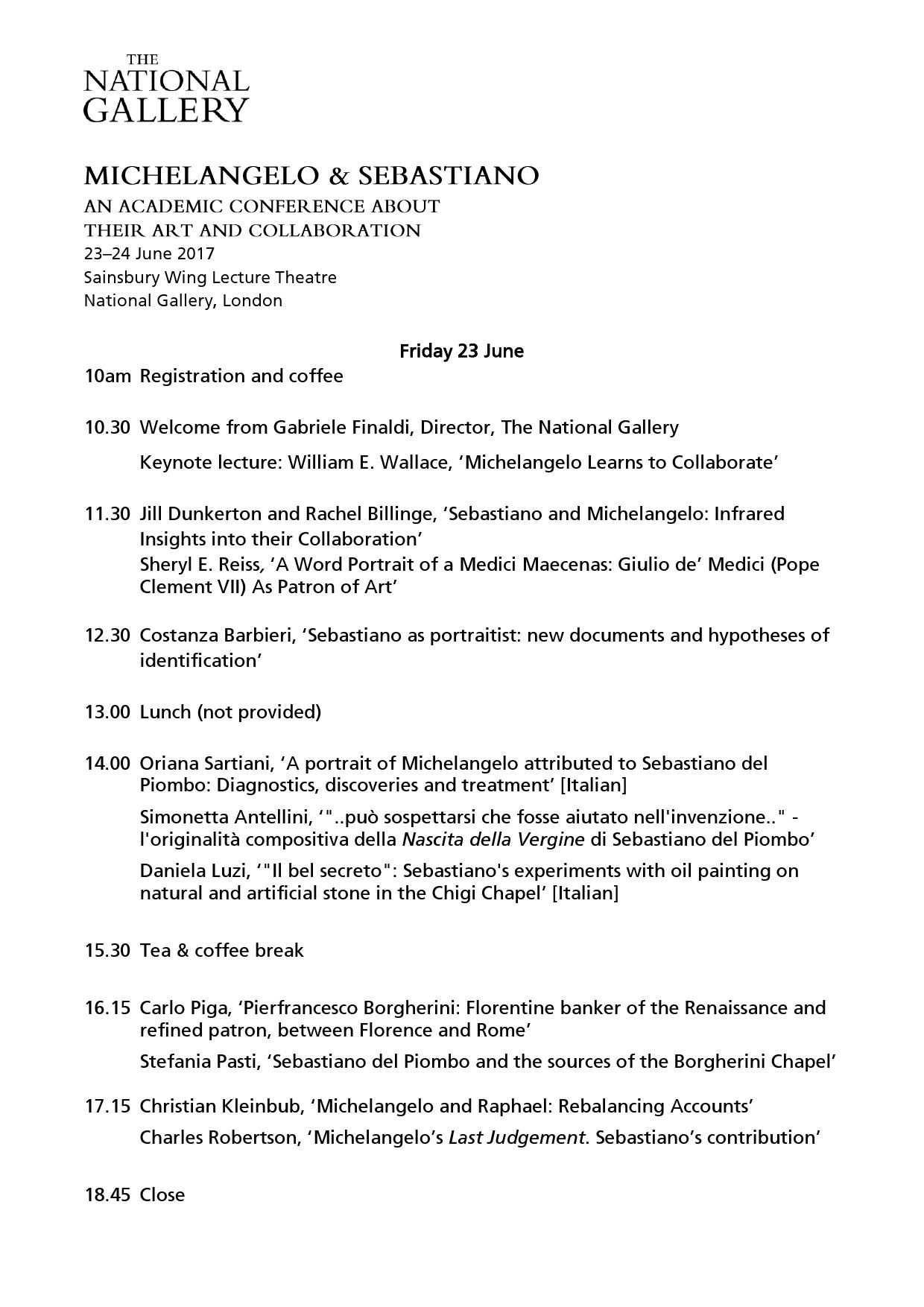 CONFERENCE – Michelangelo & Sebastiano – The National Gallery London – 23 & 24 June 2017 Posted byM. EllisJune 8, 2017June 25, 2017Posted inUncategorizedTags:Adam Lowe, Andrea Donati, Artes, Carlo Piga, Charles Robertson, Christian Kleinbub, Constanza Barbieri, Daniela Luzi, Gabriele Finaldi, Jill Dunkerton, Joost Keizer, Lynn Roberts, Matthias Wivel, Michelangelo & Sebastiano, National Gallery London, Oriana Sartiani, Paul Joannides, Peter Schade, Piers Baker-Bates, Rachel Billinge, Sheryl E. Reiss, Silvia Danesi Squarzini, Simonetta Antellini, Stefani Pasti, Uncategorized, William E. Wallace Share this: Click to share on X (Opens in new window) X Click to share on Facebook (Opens in new window) Facebook Like Loading... Related