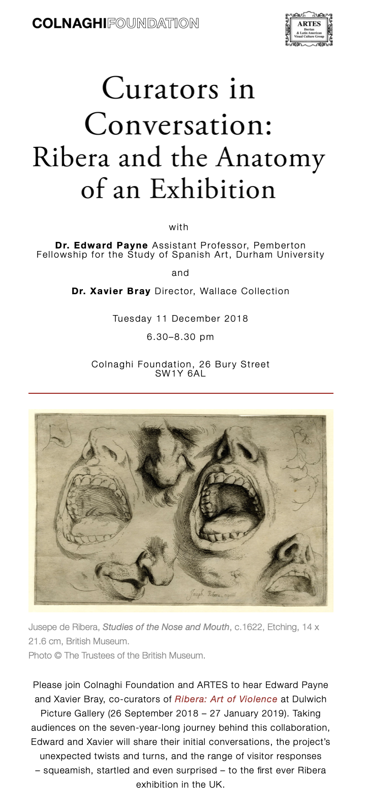 Members’ Event: Curators in Conversation: Ribera and the Anatomy of an Exhibition, Colnaghi Foundation, 11 December 2018, 6:30–8:30pm Posted bycostanzabeltramiNovember 19, 2018November 19, 2018Posted inARTES EventTags:ARTES events, colnaghi foundation, curators in conversation, Edward Payne, London, Ribera: Art of Violence, Xavier Bray Email info@colnaghifoundation.org to book a place. Share this: Click to share on X (Opens in new window) X Click to share on Facebook (Opens in new window) Facebook Like Loading... Related