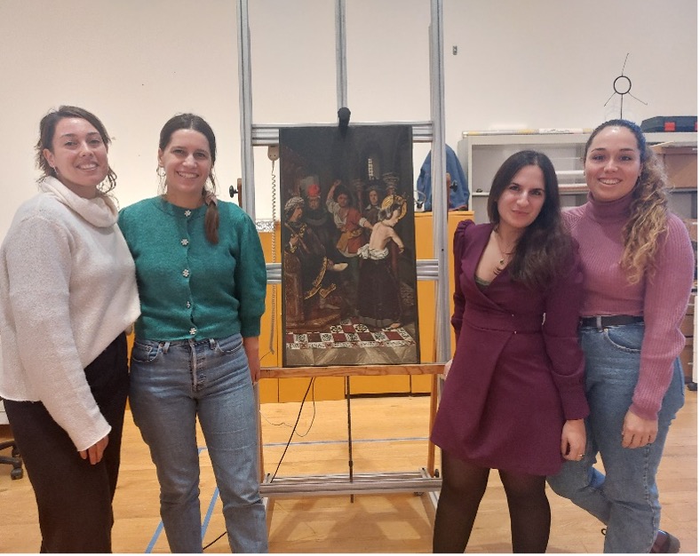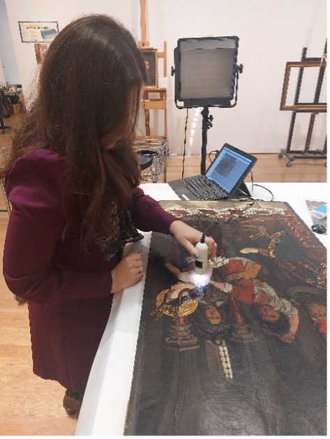 For the first two days of my trip, I stayed in Bilbao, where I visited the Museo de Bellas Artes and met the Head of the Department of Conservation and Restauration, María José Ruiz-Ozaita. She first conducted a guided in-situ examination of the Flagellation of Saint Engracia with a UV light to demonstrate the areas of restoration and remaining signs of damage. The conservation team then provided me with a microscopic lens and digital microscopic light to take close-up images of the whiplashes on Engracia’s back, blood spurts, and other minute details in the painting, such as inscriptions and skin pigmentation. This opportunity to gain a precise view of such details, as well as document these findings, enabled me to pinpoint the location of damage and wounds on the pictorial surface. The digital microscopic light also allowed me to detect the exact pigmentation of blood and skin colour which would not have been possible even by looking at a digital high-resolution image. The UV picture provided by the Museum also facilitated the identification of paint damage and uncovered novel conclusions regarding the depiction of the tortured body, thus demonstrating that it was more dramatic to fifteenth-century viewers than it currently appears. The stage micrometre was used to measure the sizes of lashes and blood drops, revealing Bermejo’s detailed and precise representation of torture. This research has opened a new series of questions in outlining the importance of blood and wounding as central elements of Engracia’s pained body.