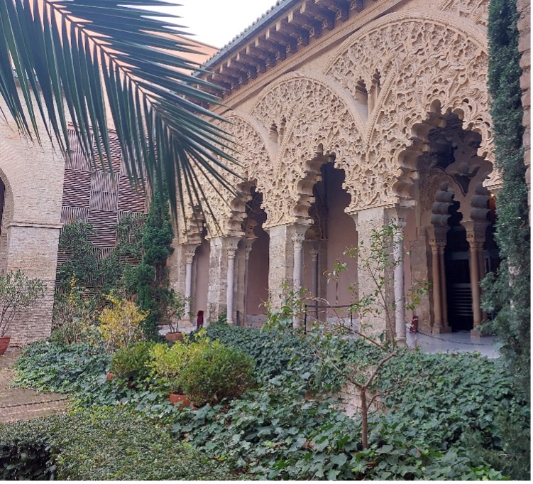 I also visited the Basilica of Saint Engracia, which marks the location where Engracia was martyred. The building was previously a monastery church destroyed in the Siege of Zaragoza in 1809, and so it was reconstructed into the Basilica. By examining her shrine, I gained a better sense of her regional importance within Zaragoza, which informed the motives behind the commission of the altarpiece in Daroca. My final pursuit in Zaragoza was a visit to the Palacio de la Aljafería, where I observed and took photos of architectural inspirations for the portrayal of Dacian’s Palace in the Arrest of Saint Engracia, Imprisonment, and Flagellation. I was able to identify better some of the patterns and architectural elements depicted in the panels of the altarpiece.