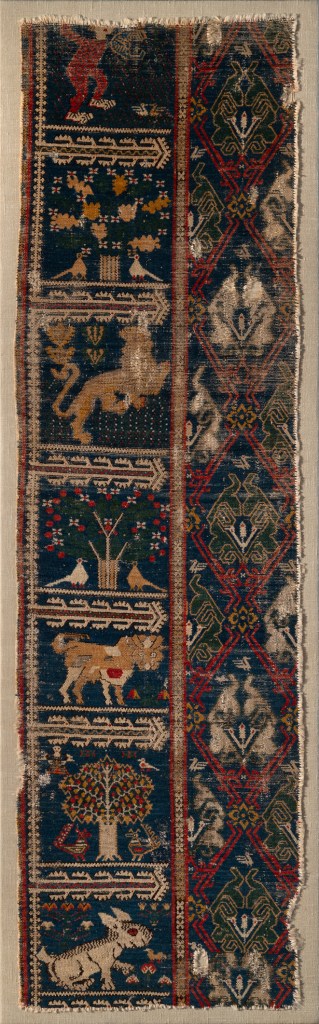 Among the works on view, we would like to single out a fragment of a border of a carpet from the collection of the Instituto Valencia de Don Juan, Madrid, dated between the late 15th or early 16th century and representative of the group of ‘Mudéjar’ carpets with heraldic coats of arms, which must have been particularly splendid. In the band on the left with a blue ground, we find heavily stylised pseudo-Kufic elements that form squares containing a tree or a vase of flowers flanked by stylised birds in alternation with figures of animals, including a rampant lion, a bull and a hare. At the top, we see a depiction, the upper part of which is unfortunately cut off, of a ‘man’ with a dappled red body, covered in fur, holding a kind of shield in one hand and in the other, which we cannot see, probably a sword or a lance, like in other exemplars with the same scene. On the right, we instead find geometric, stylised floral motifs, also on a blue ground, arranged in a grid of lozenges outlined in red.