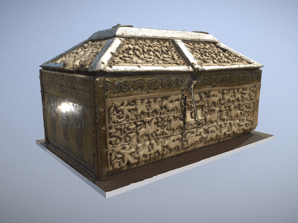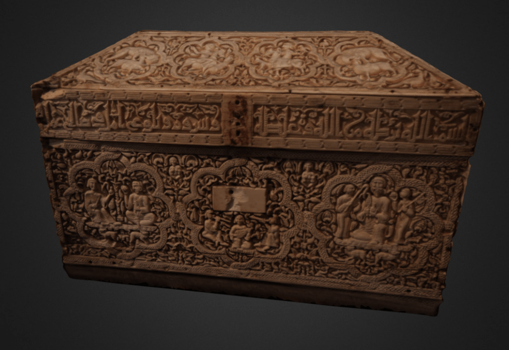 Also known as the Leyre casket, the Pamplona casket has been attributed to approximately 1004-5 AD. It is made from 19 intricately carved ivory panels. it depicts the vegetal motifs and enclosed roundel designs typical of that period. several artists have been attributed to this casket, suggesting it was made in a workshop. It has been suggested that this casket was made for ‘Abd al-Malik al-Muzaffar for his victory in Leon. On the casket we can also see motifs of Islamic princely life, a typical subject matter to be included in Islamic ivory caskets. It is currently housed in the Pamplona Cathedral. (Erin Welds, text)