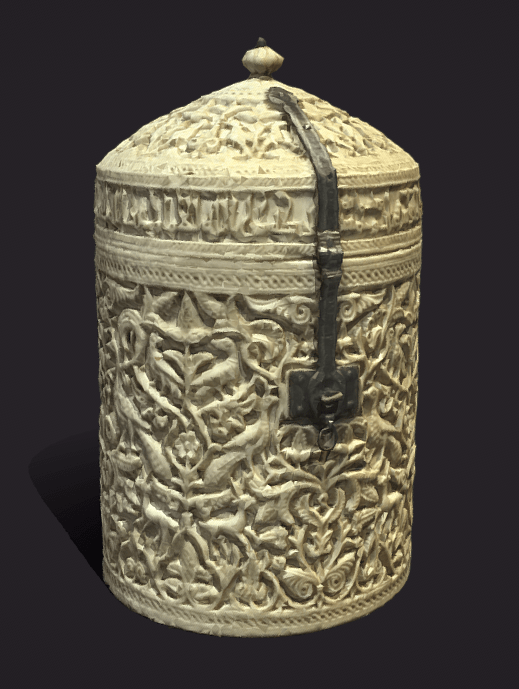 The Zamora Pyxis can be considered among a group of thirty-four surviving ivories dating to the period of 950 to 1050 CE, produced at Madīnat al-Zahrā. The pyxis is cylindrical in shape with a domed lid and produced from an elephant ivory tusk. The décor of the pyxis is rich with both vegetal motifs and iconography. The vegetation consists of palmettes, leaf forms and flowers, while the zoomorphic elements consist of peacocks and birds. These scenes take place along repeated vertical axis, the use of symmetry in décor was regularly employed in the artwork produced at Madīnat al-Zahrā. The inscription on the base of the lid is in Kufic form and shows that the Pyxis was commissioned by al-Hakam II for his concubine Subh. The pyxis was made by Durri al-Saghir (a eunuch adopted by ʿAbd al Rahman III and director of ivory workshop) in 353 after Hijra/ 964 CE. (Warda Malik, text)