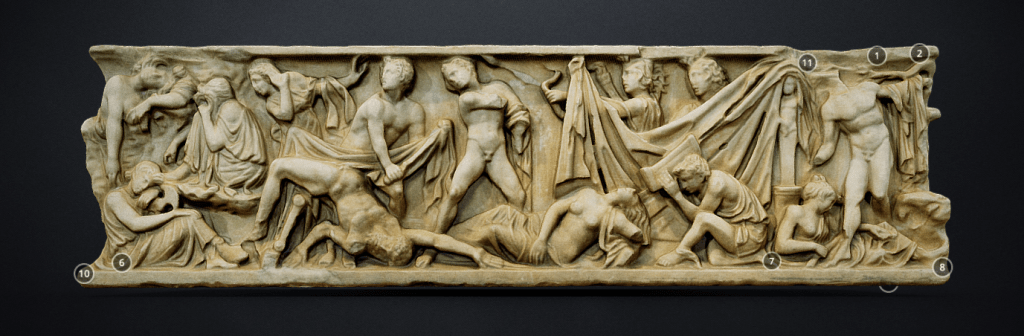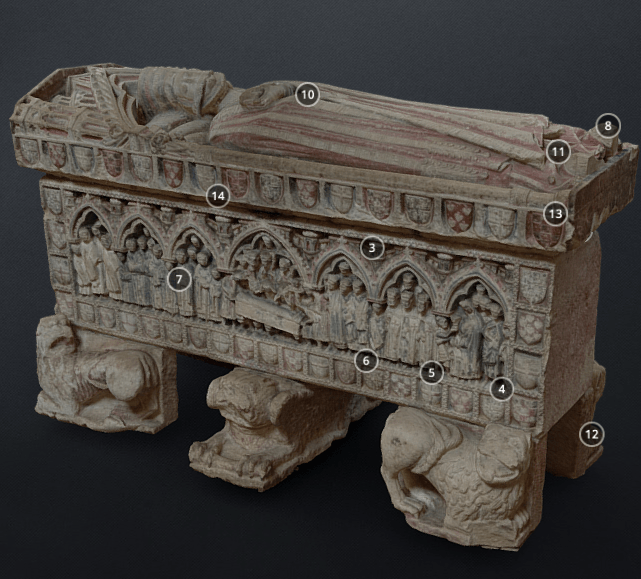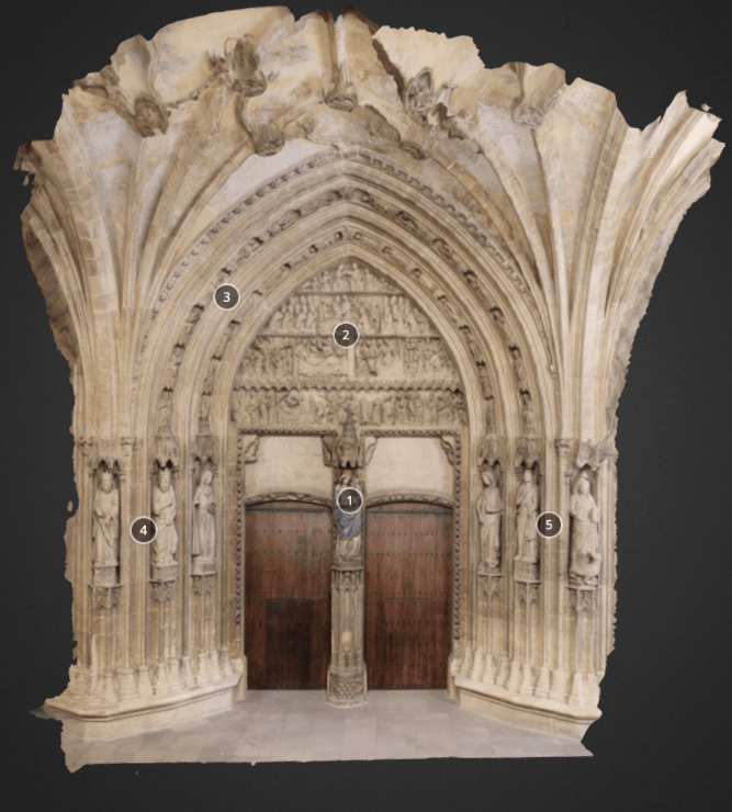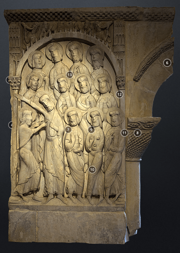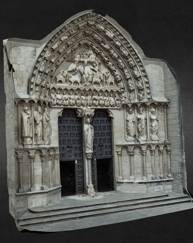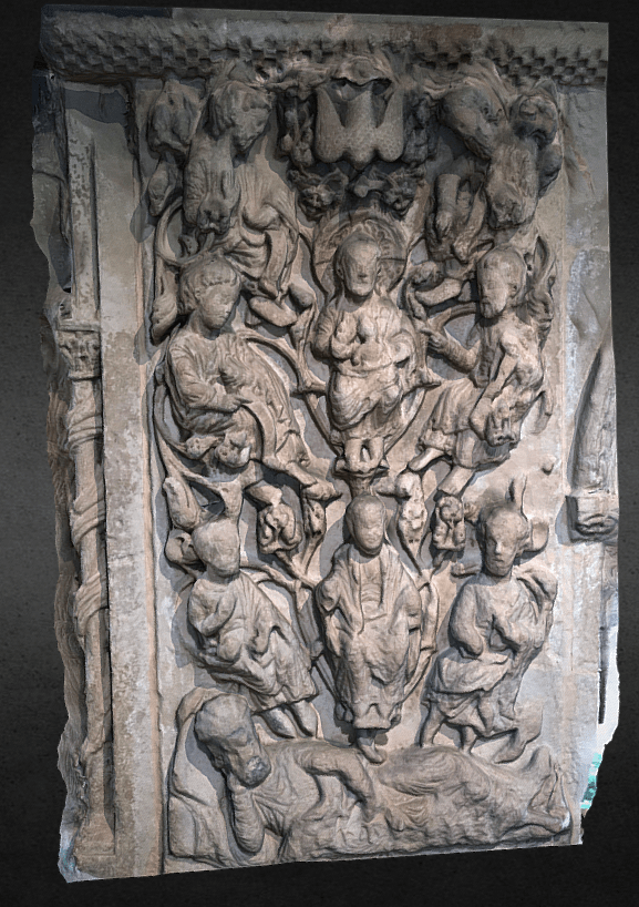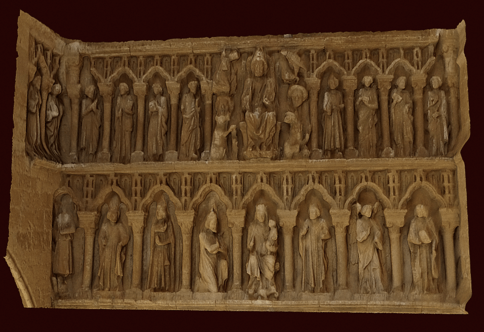 The Puerta Preciosa (c. 1318-1355) served as the threshold between the cloister and the private dormitory of the canons of Pamplona, who lived communally in the cathedral complex until the middle of the nineteenth century. The door’s name derives from a psalm, beginning with the words ‘Preciosa in conspectu Domini…’ (precious in the sight of the Lord…), which was sung by the canons as they retired to their sleeping quarters in a nightly procession. This partial digital reconstruction of the portal shows details from the tympanum, which includes scenes from the end of the life, the death, and the coronation of the Virgin. The inner archivolts visible in the 3D model feature a series of crowned women, standing beneath microarchitectural canopies. Click here for an image of the entire Puerta Preciosa, which includes additional Marian imagery, such as the Annunciation jamb figures. [Jamie Haskell, July 2020]